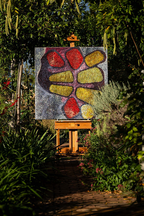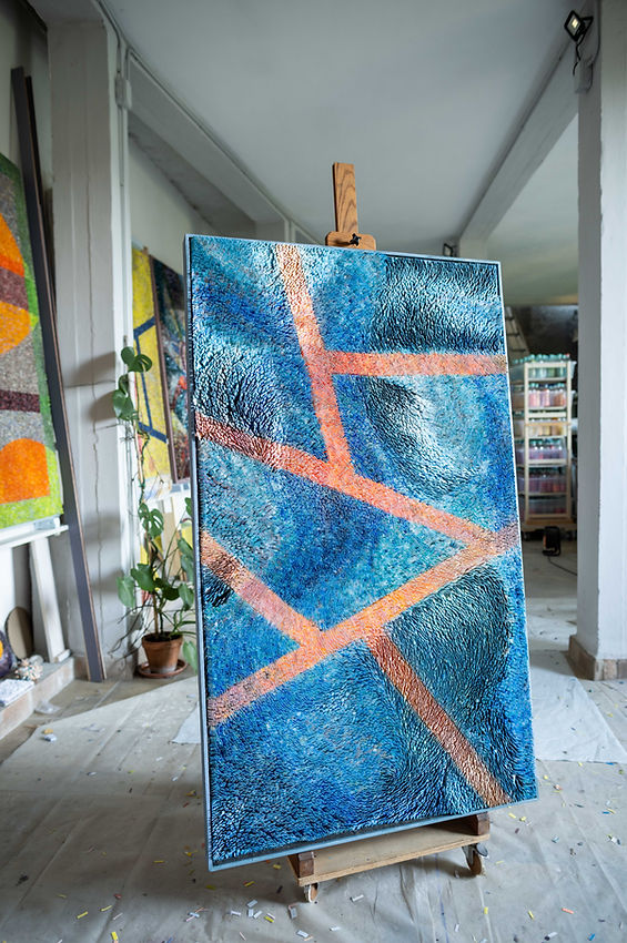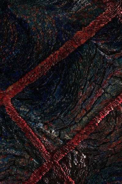 His mosaics are not static images but breathing surfaces: matter that records, reflects, and transforms with time.